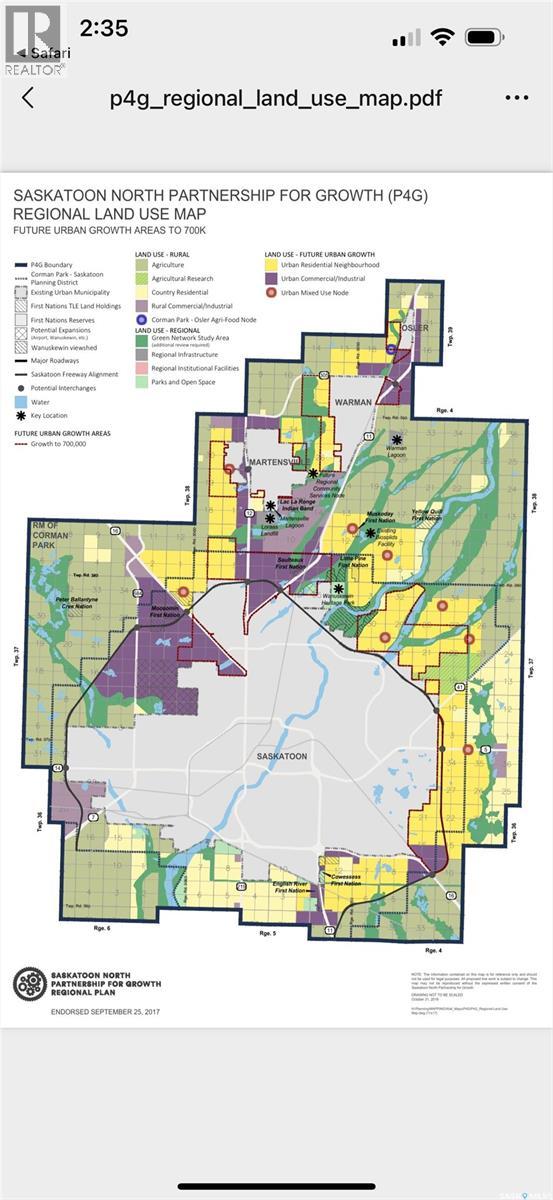 132 acres just 0.8 KM of South Hwy16, 1.6KM south of south Costco, and 2.4KM east of Greenbryre golf course, the great potential new development with service close. A good gravel road on the east of the land. The land has the following features: 1) 2 titles land, one is 77 acres, another parcel is 56 acres. Build your dream house and hold for future development. 2) It is zoning as Agricultural District 2 (DAG2), so many business opportunity can be established. Contact RM Corman Park or listing agent to get the potential business listing sheet. This property could be set up for many different purposes, such as, a single detached dwelling, agricultural operation, agricultural tourism use, bed and breakfast home, and home based business type III, etc. 3) Farm tenant in place to maintain this cultivated land with a yearly return. Currently, the land rented year by year. (id:35980)
