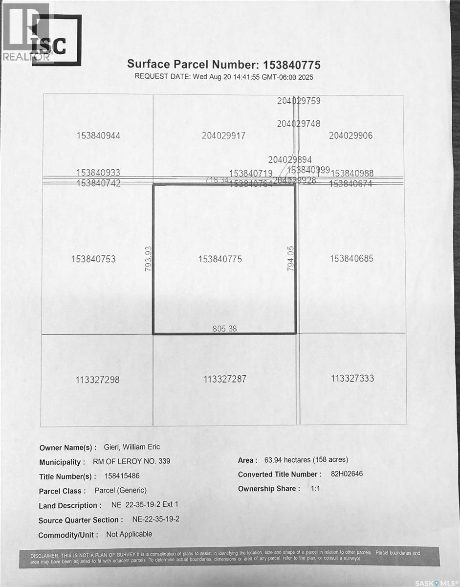 Prime Saskatchewan Farmland — 623 Acres (607 Cultivated) Excellent opportunity to add scale with a highly workable block of farmland in the LeRoy area. The package includes three adjoining quarters in the RM of LeRoy, plus one quarter in the RM of Lakeside approximately 3 miles away. Total land base is 623 acres with approximately 607 cultivated acres, offering an outstanding cultivated ratio. Soils consist of Class D & F within the Yorkton/Naicam and Cudworth soil associations, featuring loam to silty clay loam. The land is table-top level with minimal to no stones, allowing for efficient equipment operation, consistent seeding depth, and smooth harvesting. Large, open fields with excellent runability make this land well suited for modern farming equipment. A strong opportunity for producers looking to expand with clean, productive, easy-to-farm land in a proven agricultural district.Call today for more information! (id:35980)
